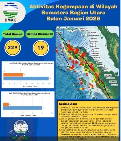 Deli Serdang-persatuannews.com. Awal tahun 2026, wilayah Sumatera bagian utara mencatat 229 aktivitas gempa. Sebanyak 19 kejadian dirasakan oleh masyarakat.